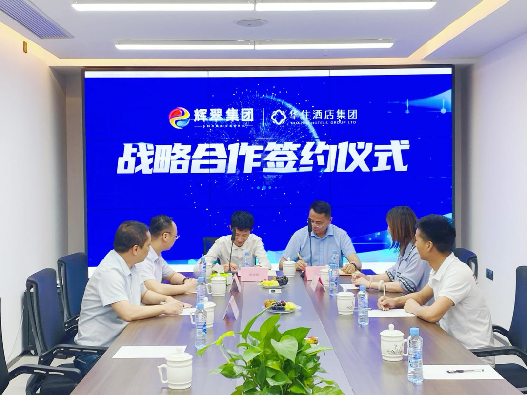 2022年6⽉8⽇,江西辉翠集团与华住集团在抚州洪观大厦举⾏战略合作签约仪式。双⽅达成深度合作框架协议,将实现资源、产业优势互补,强化品牌服务。辉翠集团游晓辉、刘斌、华住集团施杭俊、陈志宇等双⽅⾼层共同出席签约仪式。